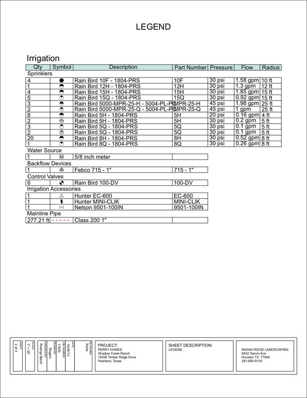 We create irrigation drawings in DWG, JPEG, PDF and other popular file formats in Houston, Texas and surrounding areas. We are reasonably priced and present a professional, polished product. Why have someone in your office struggle with the CAD software, or rely on hand sketches, when you can have them profesionally designed, quickly and efficiently? Call or email us and we will be happy to discuss your next project. The samples on this site are the property of the copyright holders as listed on the drawings.